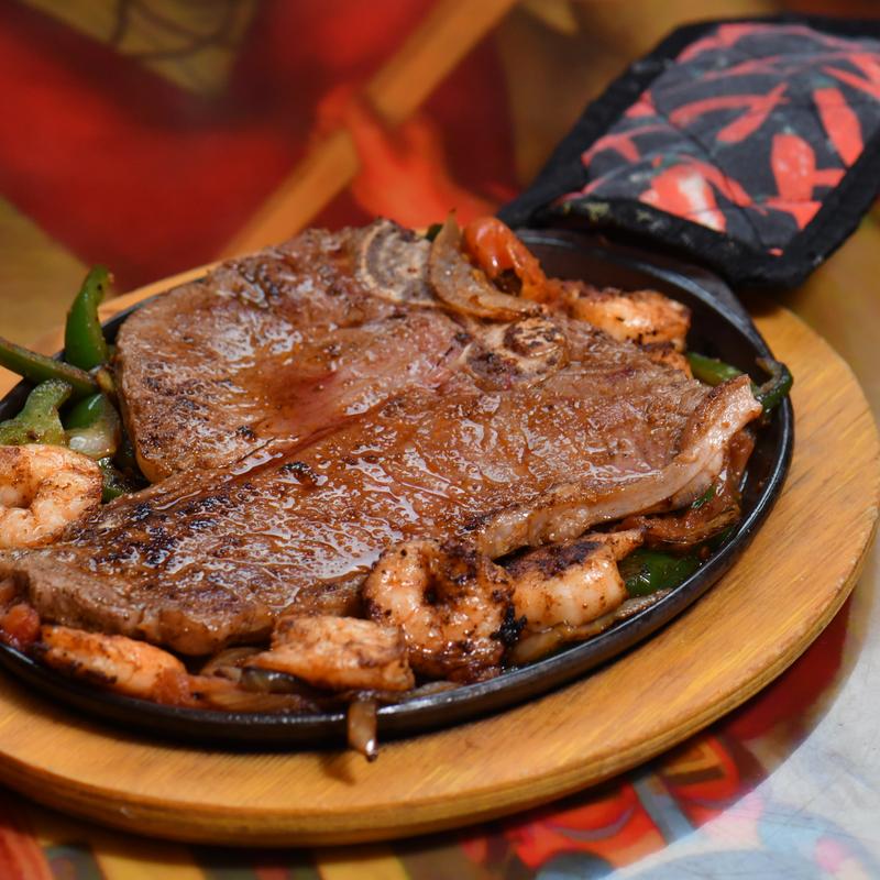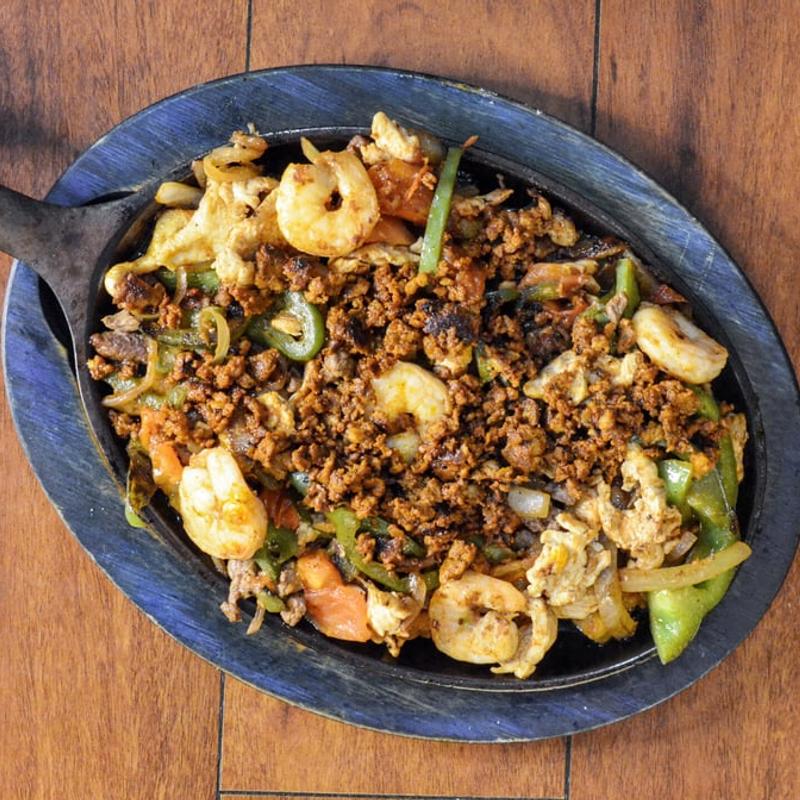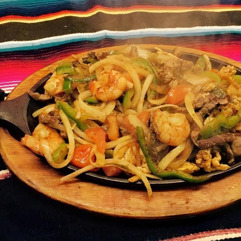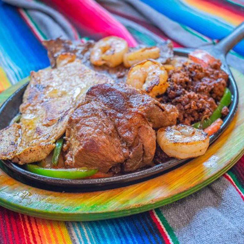 Single $21.99 | Double $41.99 • A sizzling platter of tender marinated chicken breast, carne asada, shrimp, carnitas, and chorizo with sautéed onions, bell peppers, and tomatoes. Served with rice, beans, lettuce, pico de gallo, guacamole, sour cream and a cheese quesadilla.