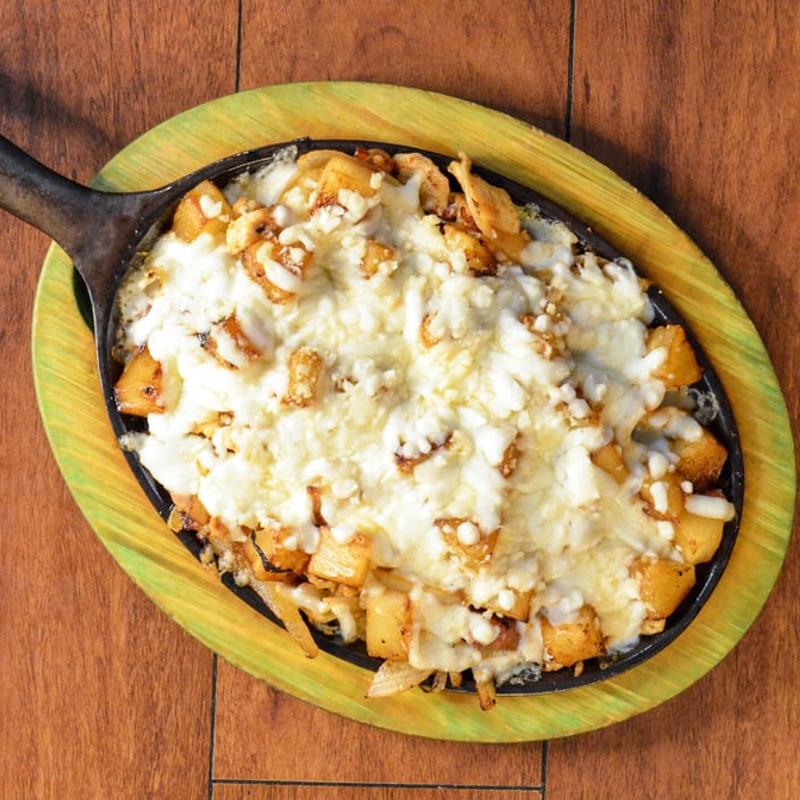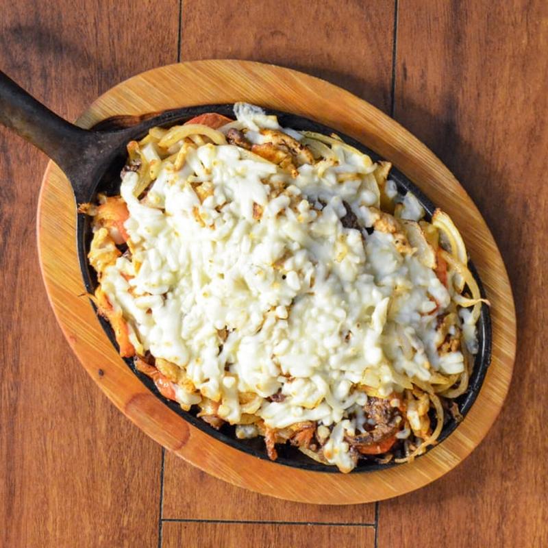 A layer of cheese topped with onions, bell peppers, and tomatoes and covered with chorizo. Served on a hot skillet