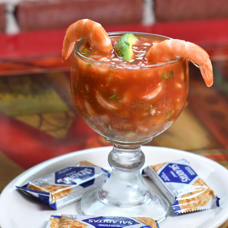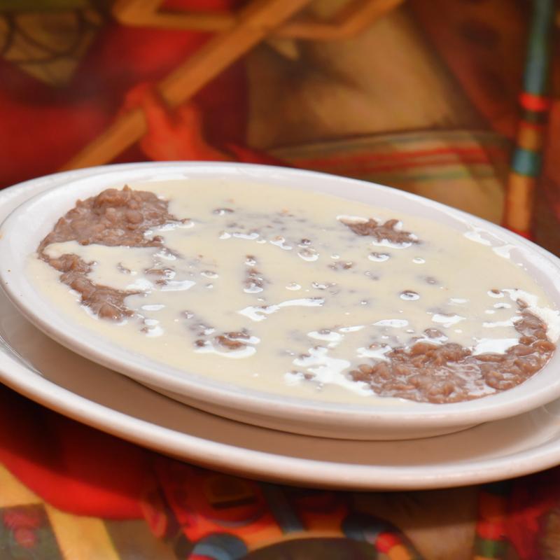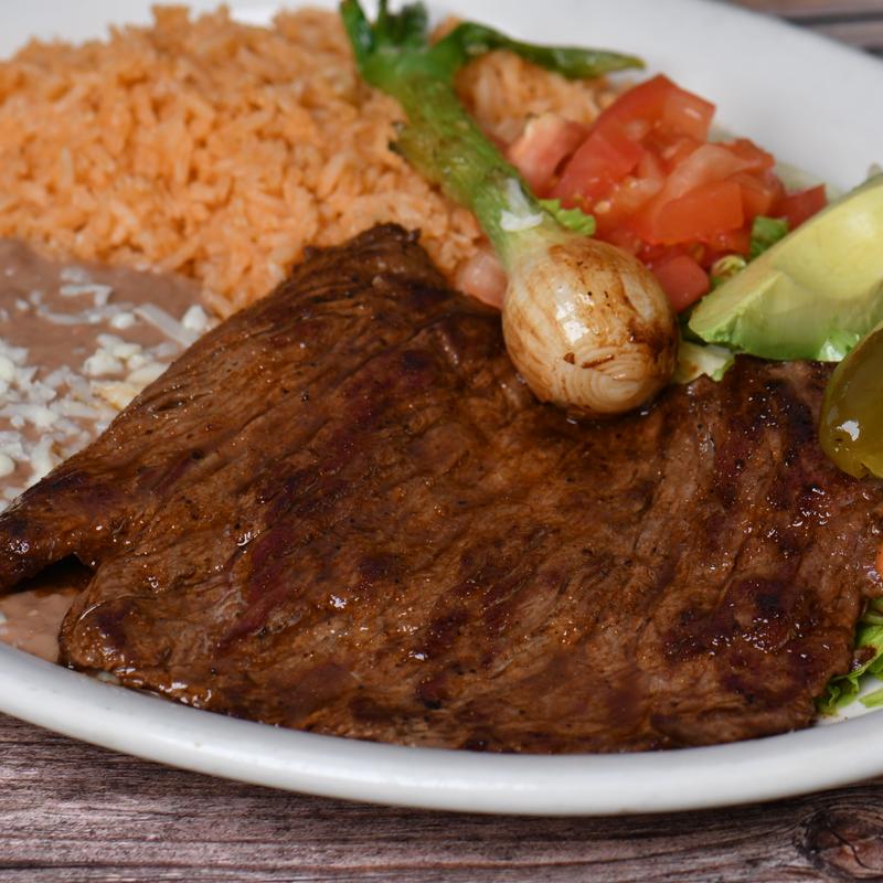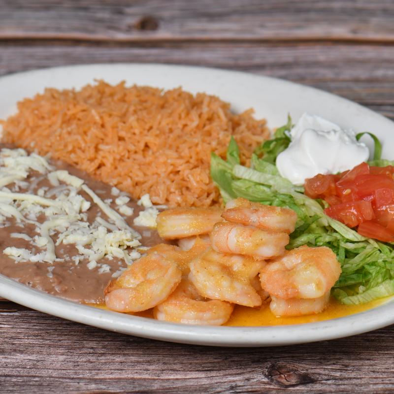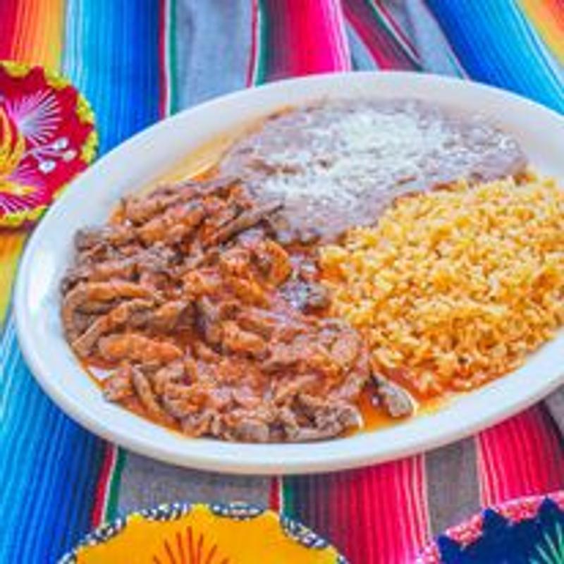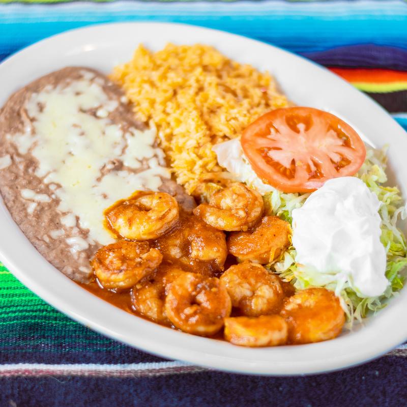Grilled steak or shrimp with onions, nopal, and whole beans topped with spicy ranchero sauce.
