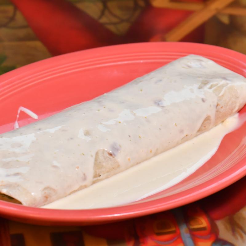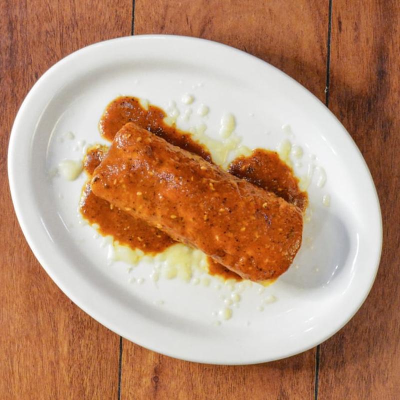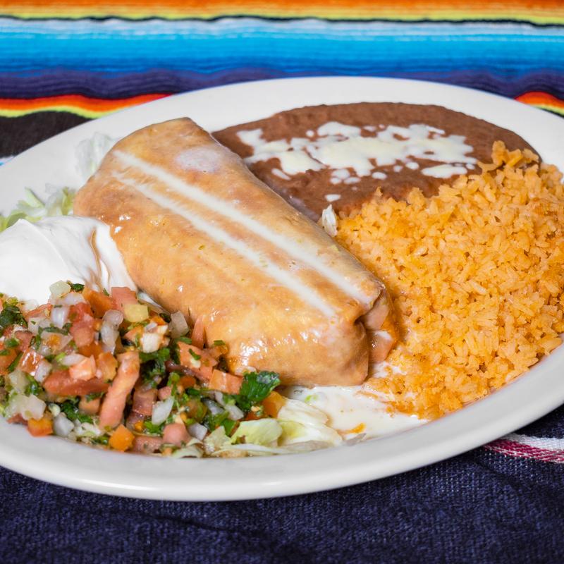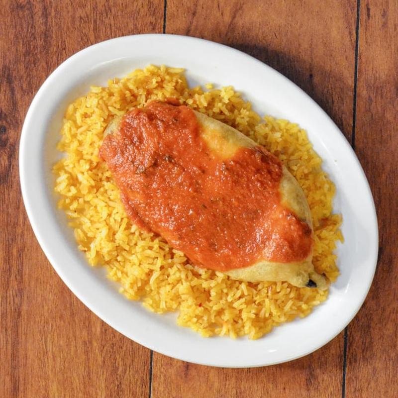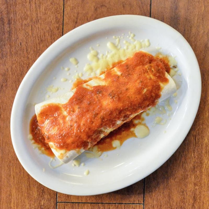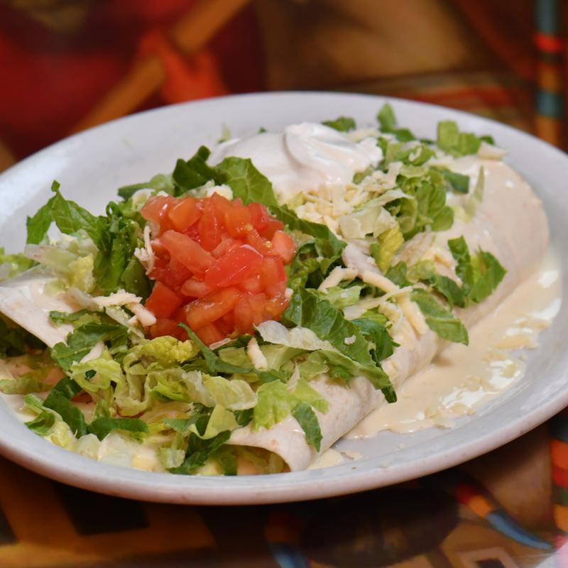A ground beef or shredded chicken burrito topped with red sauce, lettuce, tomato, sour cream and shredded cheese. Served with rice and beans.