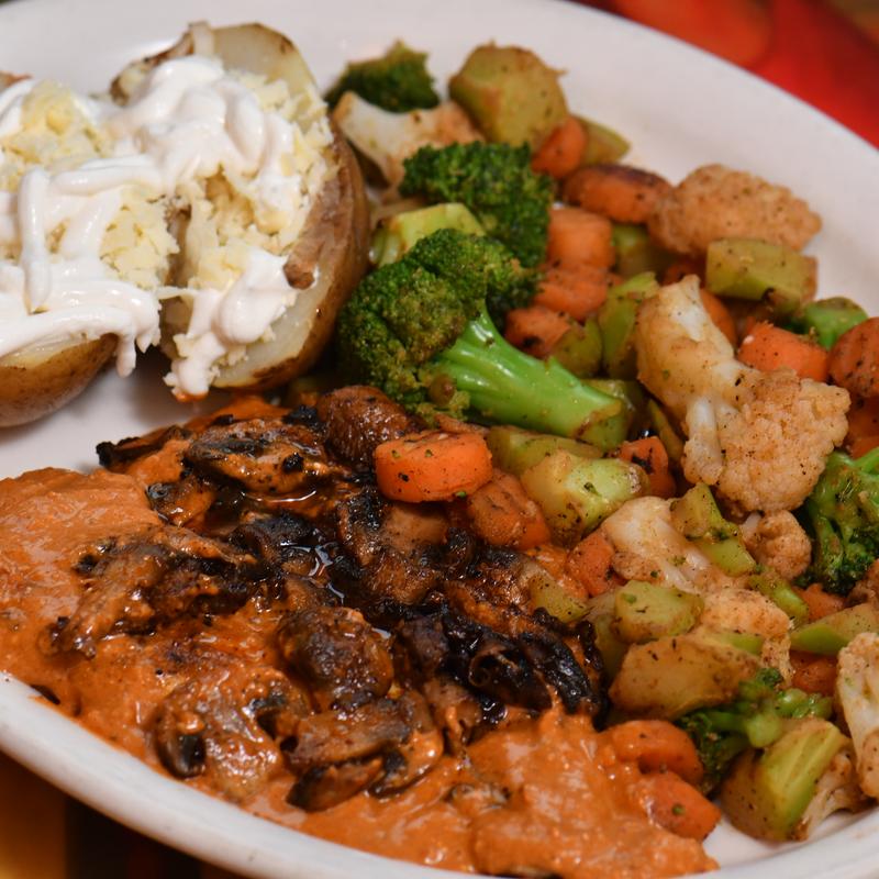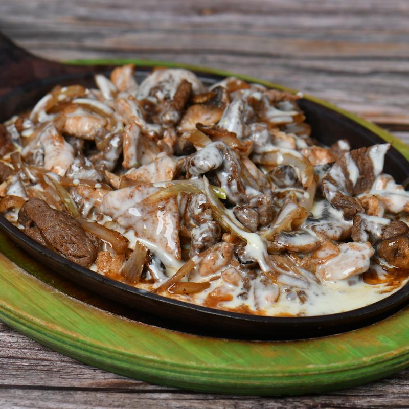 Single $17.99 | Double $31.99 • Chicken, steak, onion, tomato and mushrooms. Topped with cheese sauce.
