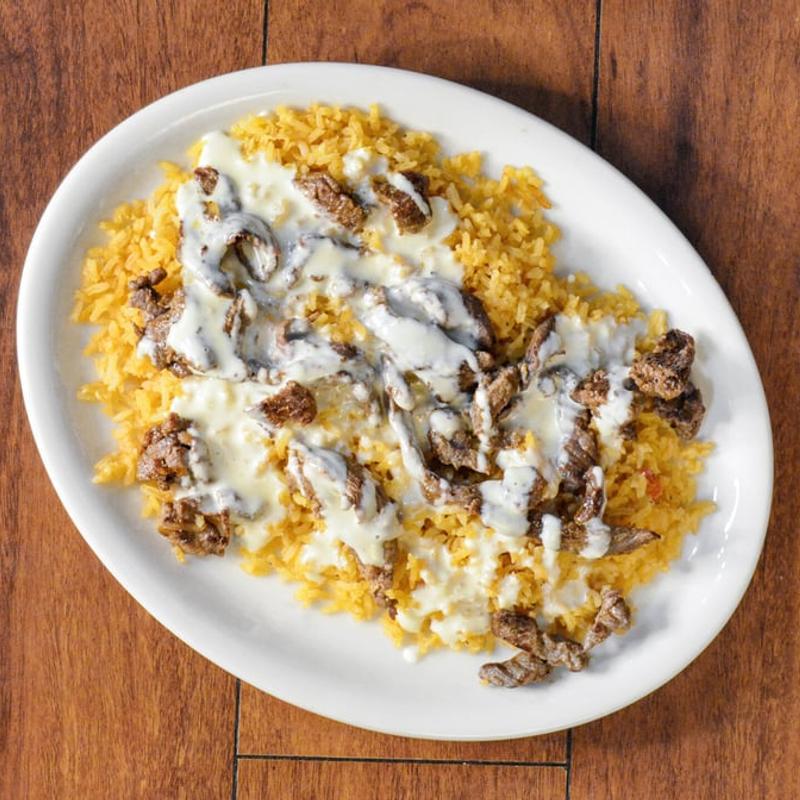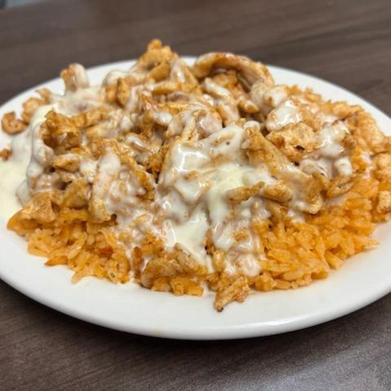 Chicken $10.99 | Steak $11.50 • A bed of rice topped with tender strips of grilled chicken, covered with cheese sauce.