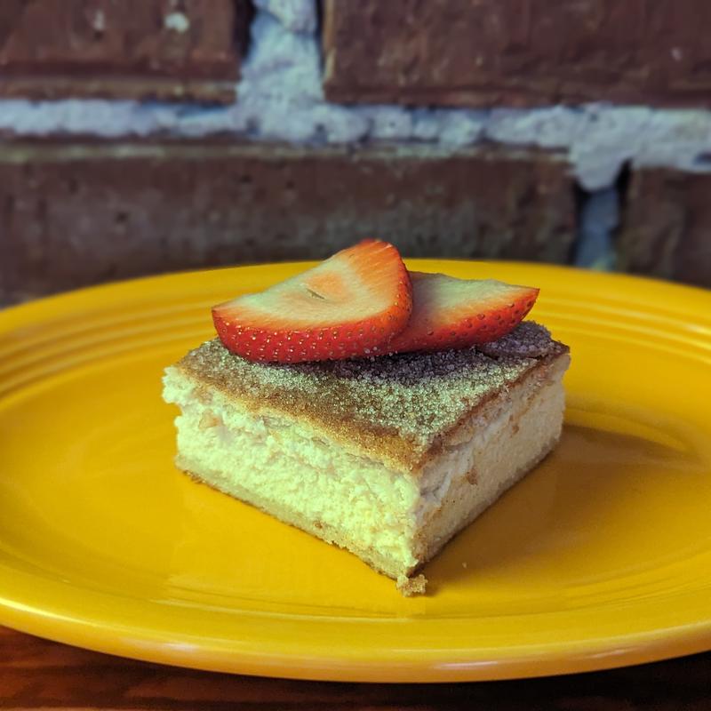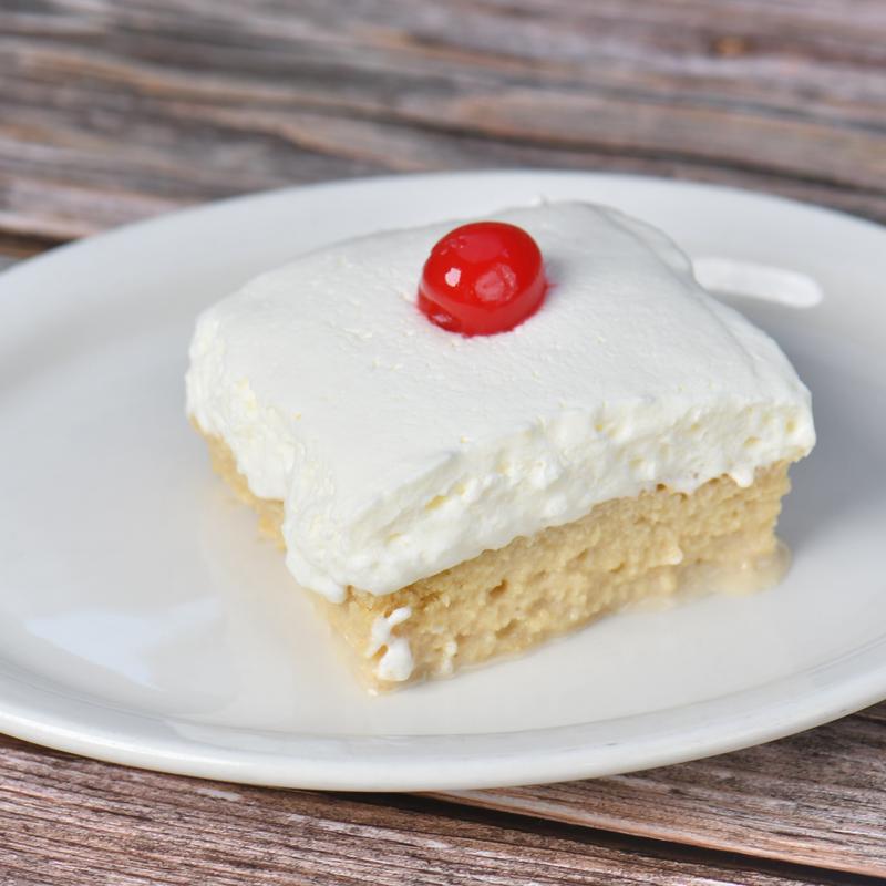 A sponge cake soaked in three kinds of milk. Topped with fresh whipped cream.