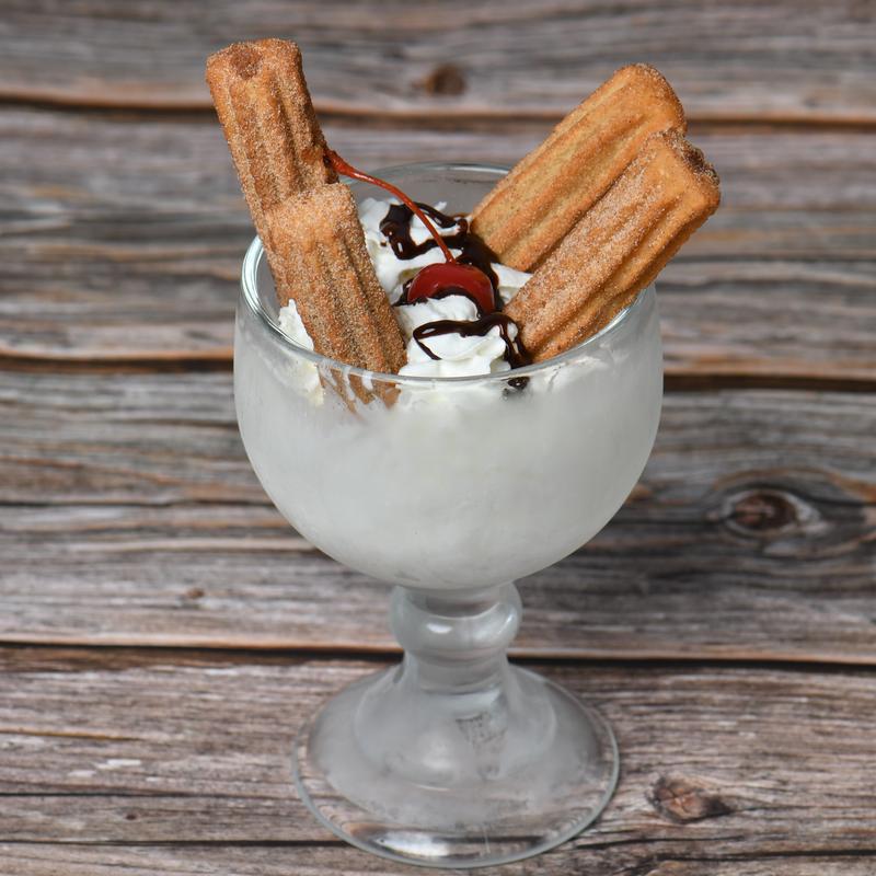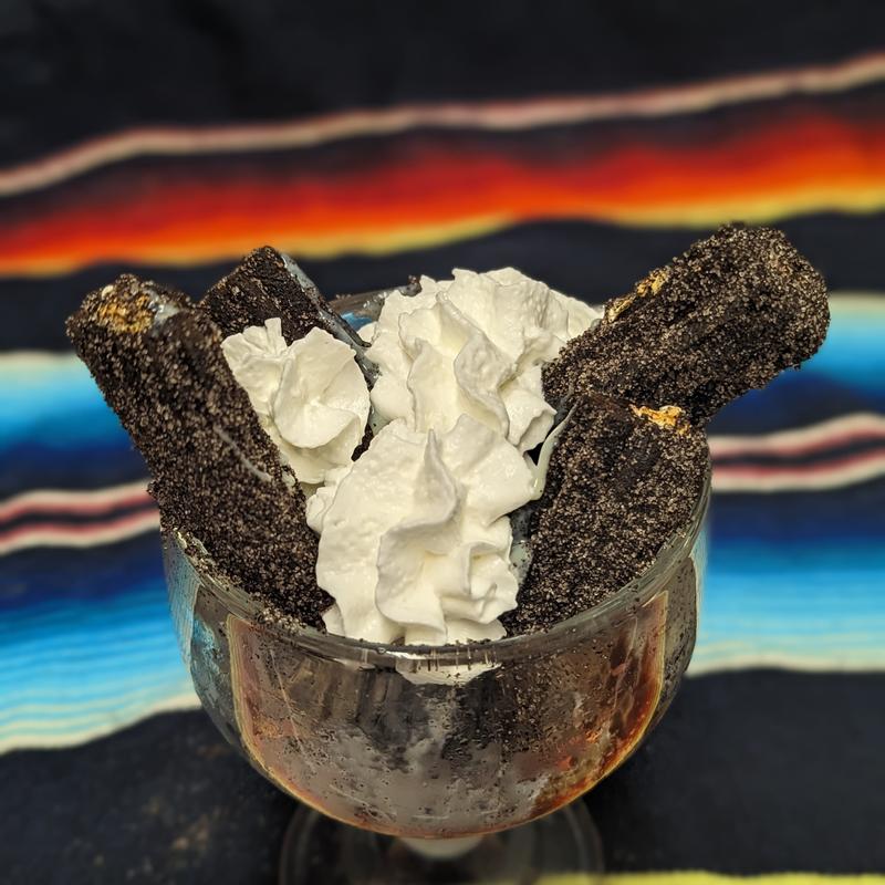 Oreo cookie churros, filled with Oreo creme. Served with ice cream, whipped cream and chocolate syrup.