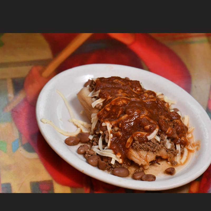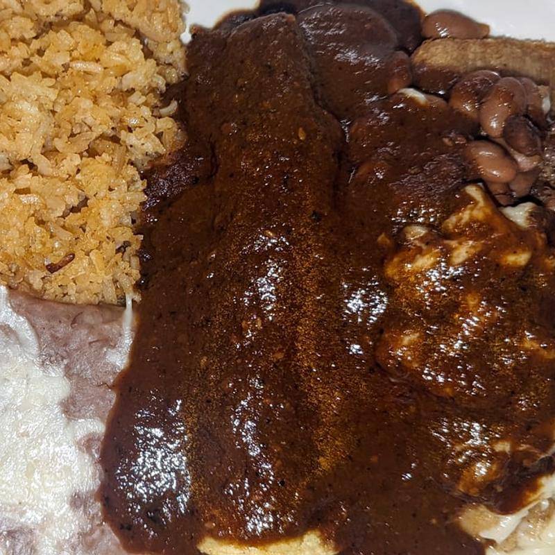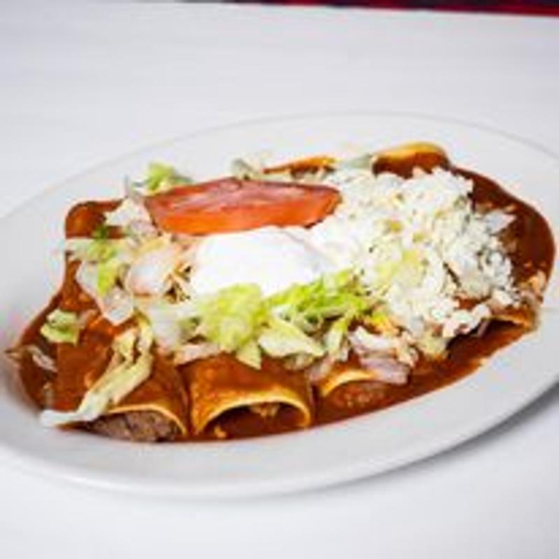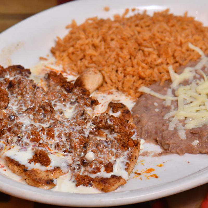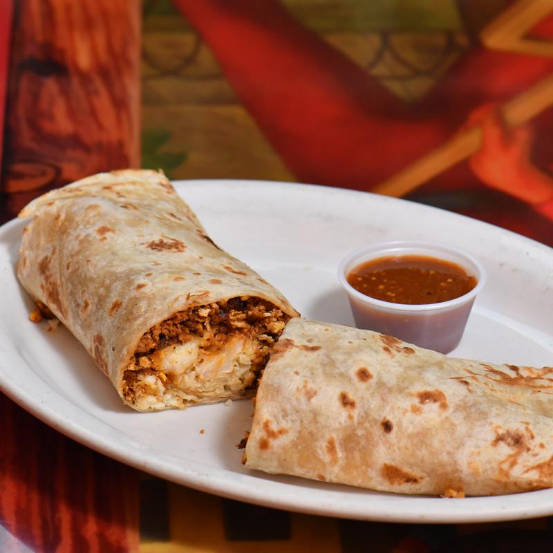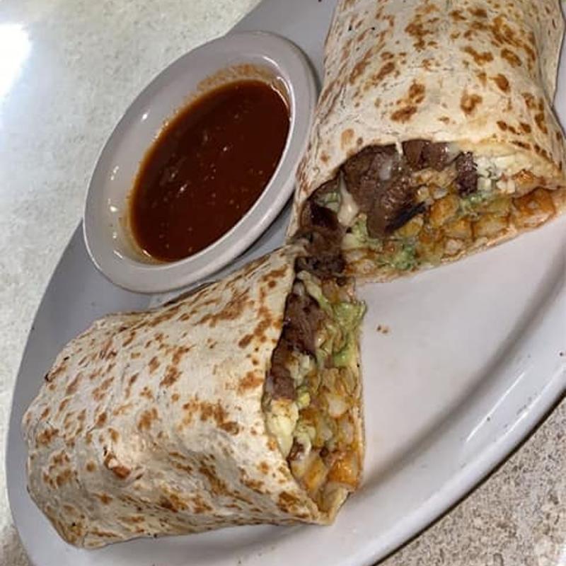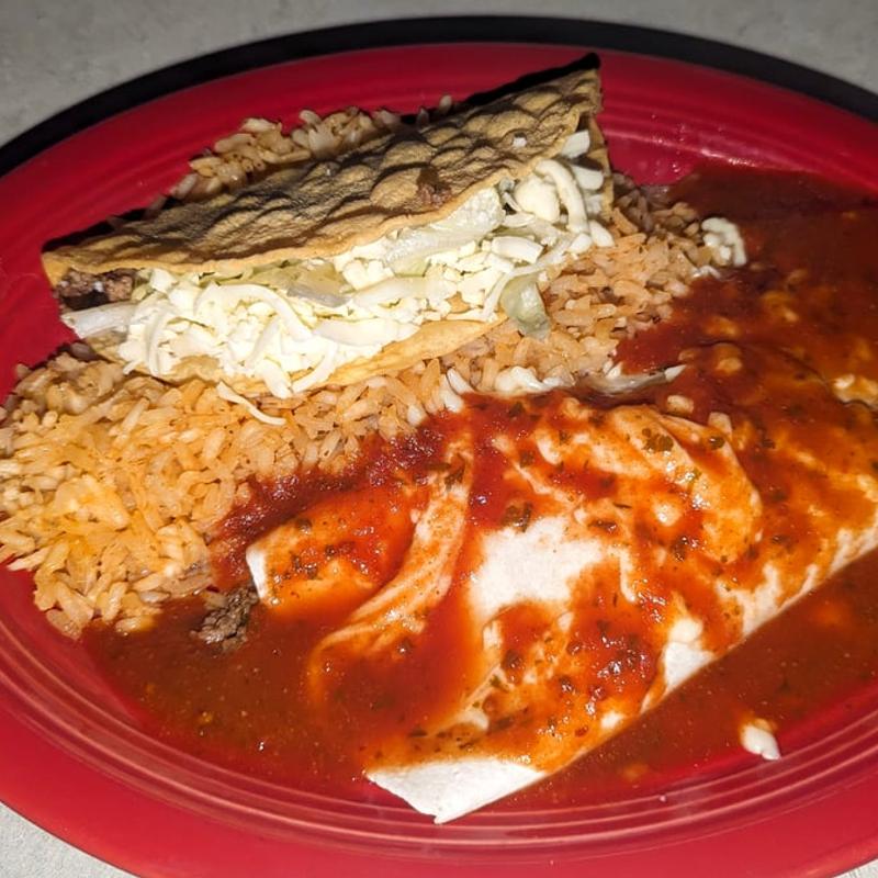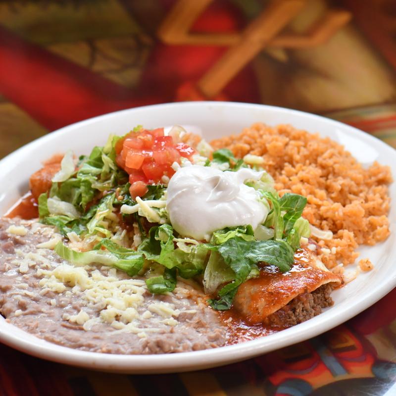 A flour tortilla filled with ground beef or shredded chicken, topped with red sauce, lettuce, tomato, shredded cheese, and sour cream. Served with rice and beans.