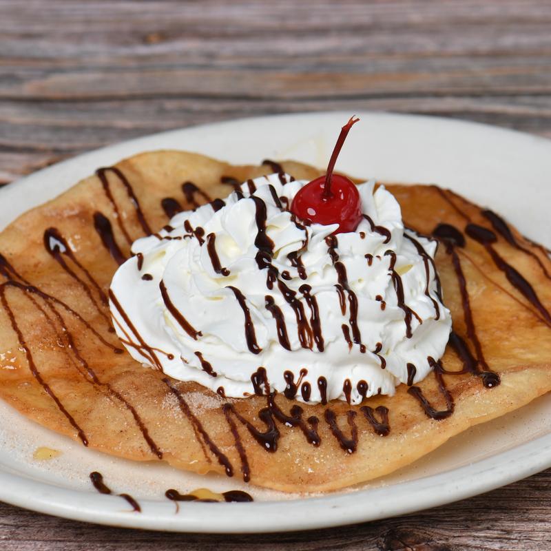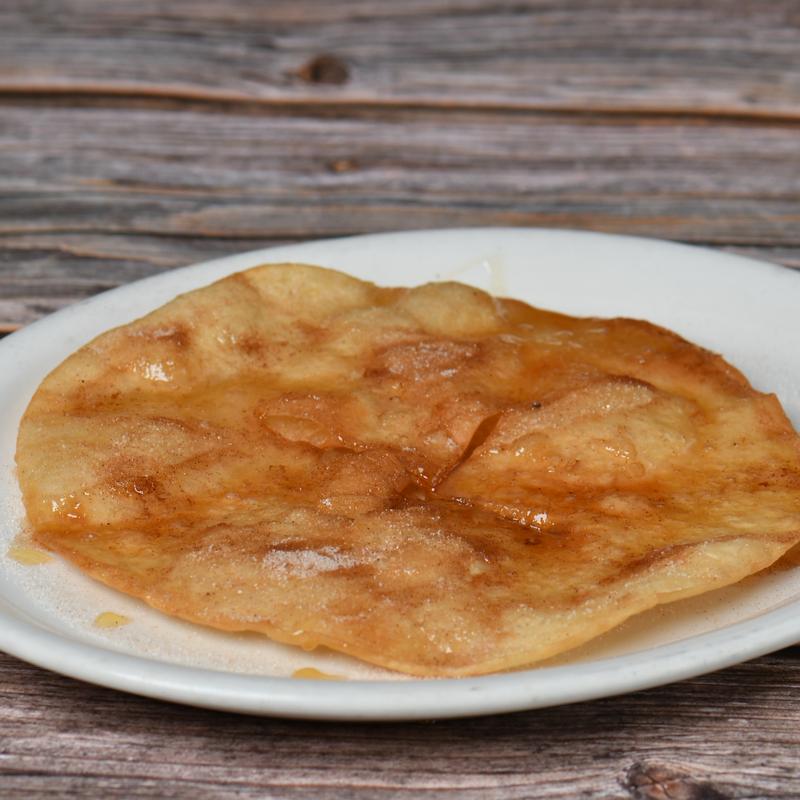 A tortilla deep-fried to a golden brown and topped with honey, butter, and cinnamon.