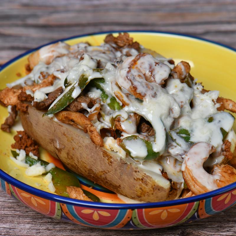 A baked potato filled with grilled chicken, steak, shrimp and chorizo cooked with bell peppers, onions and tomatoes topped with cheese sauce and sour cream.