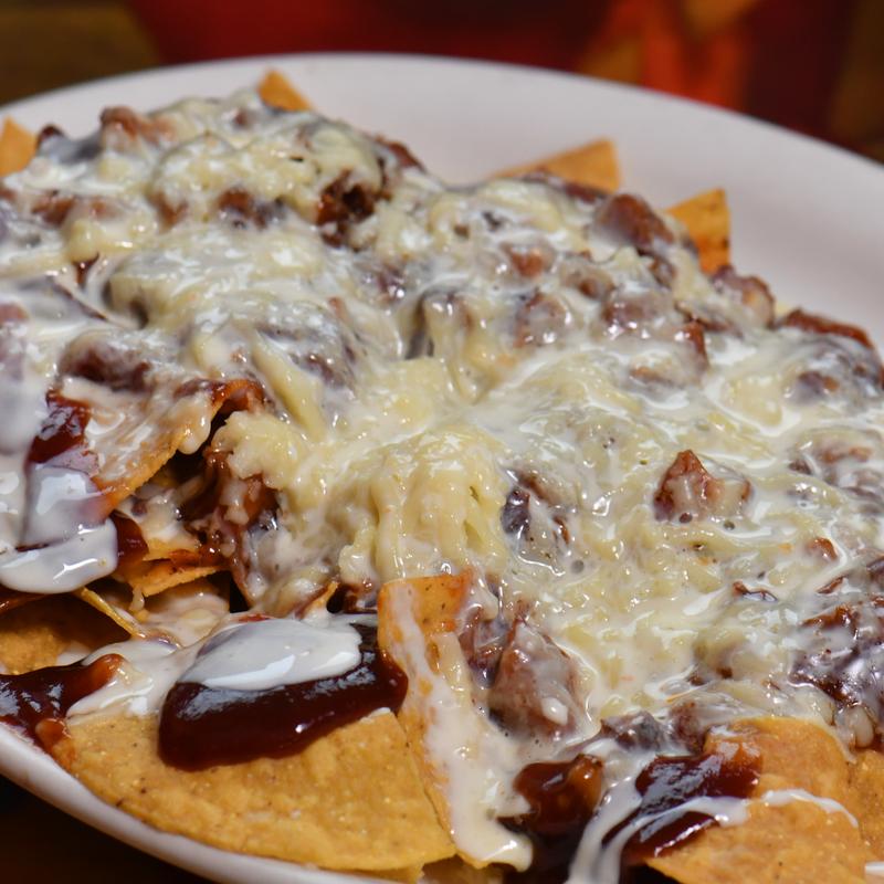 Crispy tortilla chips generously topped with cheese sauce, ground beef, shredded chicken, beans, lettuce, sour cream, tomato and shredded cheese.
