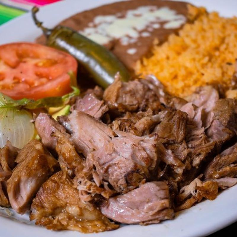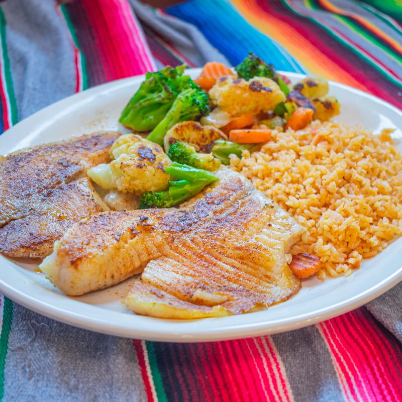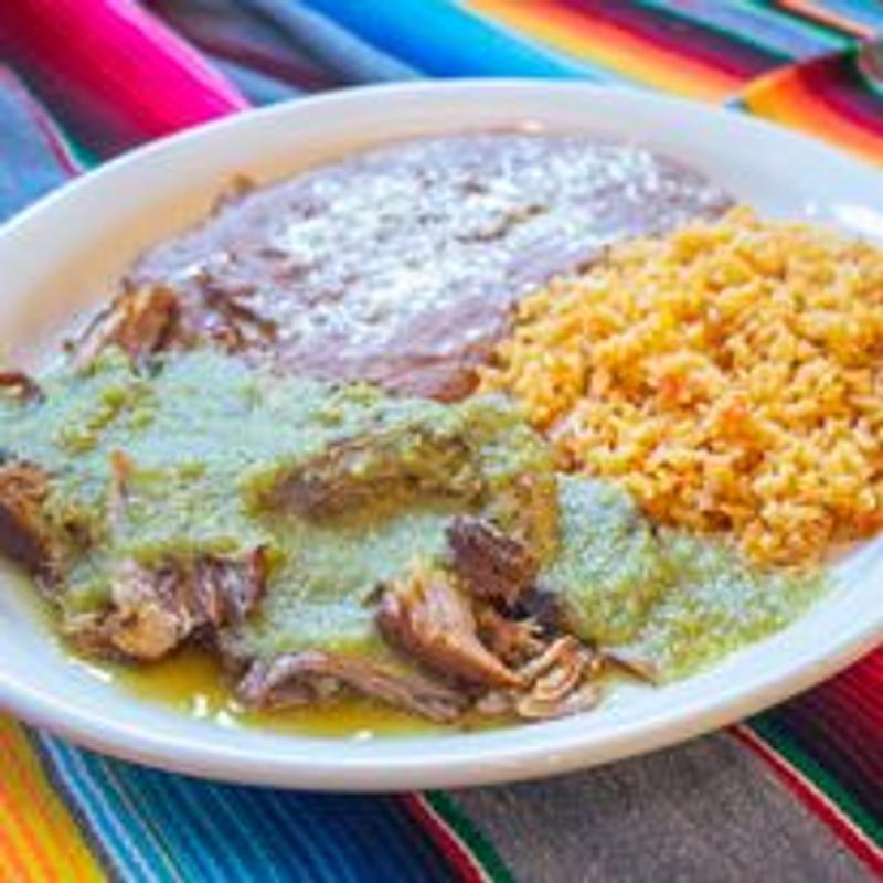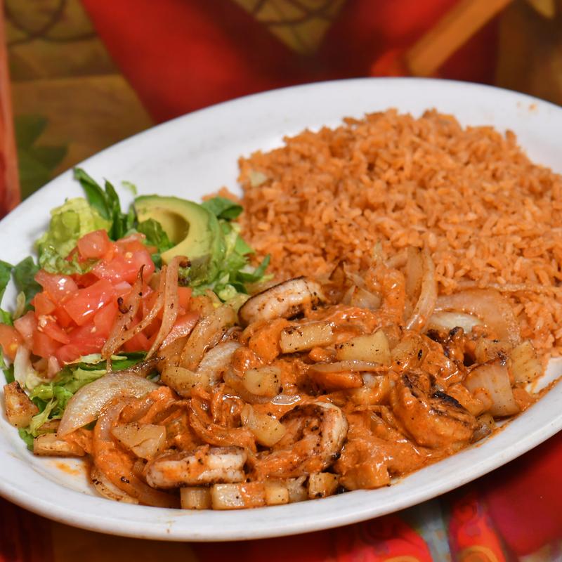 Tender strips of chicken breast, carne asada, grilled shrimp cooked with onions, bell peppers, tomatoes and chorizo. All topped with spicy tomatillo sauce, shredded cheese, nopal and Mexican knob onion. Served with rice, beans, lettuce, sour cream, guacamole and pico de gallo.