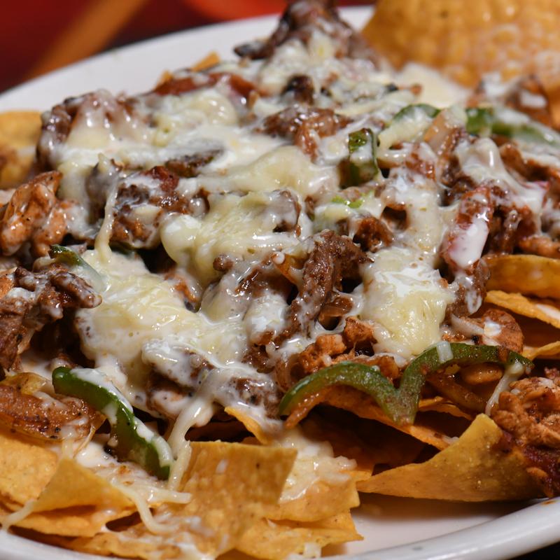 Crispy tortilla chips topped with shredded cheese, your choice of steak or grilled chicken, cooked with onions, bell peppers and tomatoes. Covered with cheese sauce.