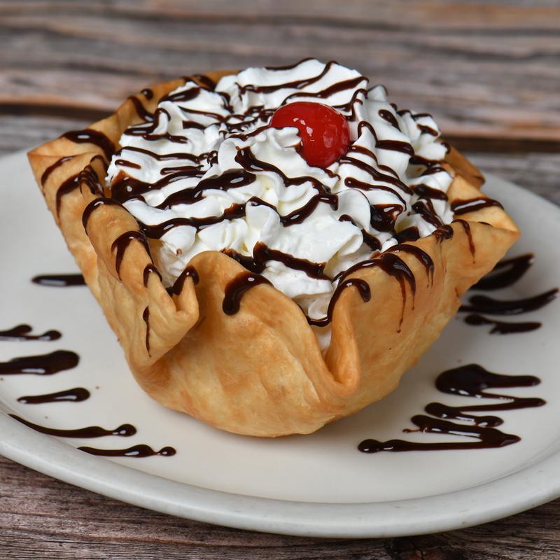 Vanilla ice cream covered with a crunchy cinnamon sugar coating, lightly deep-fried, and topped with whipped cream and chocolate syrup.