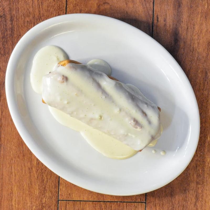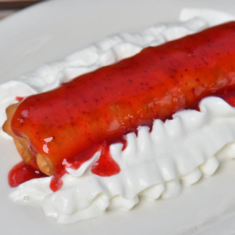 Creamy cheesecake wrapped in a tortilla, lightly deep fried then topped with strawberry syrup and whipped cream.