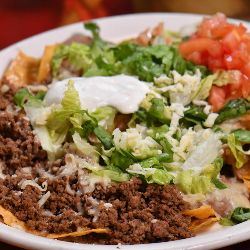 Crispy tortilla chips generously topped with beans, shredded chicken, beef, lettuce, tomato, shredded cheese, and sour cream.