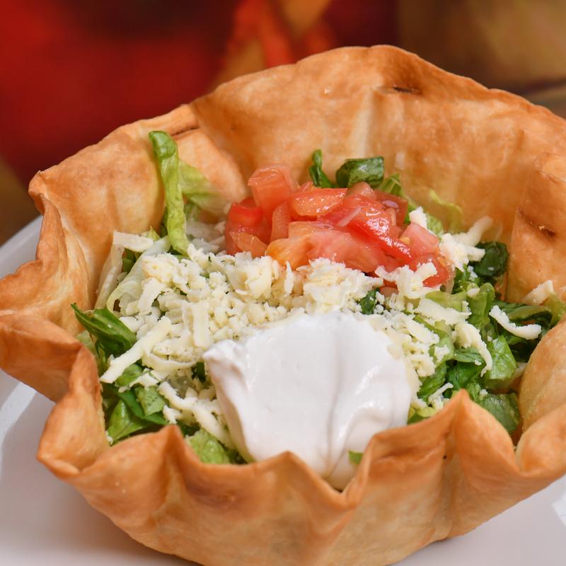 A crispy, flour tortilla bowl filled with your choice of ground beef or shredded chicken, lettuce, tomato, shredded cheese and sour cream.