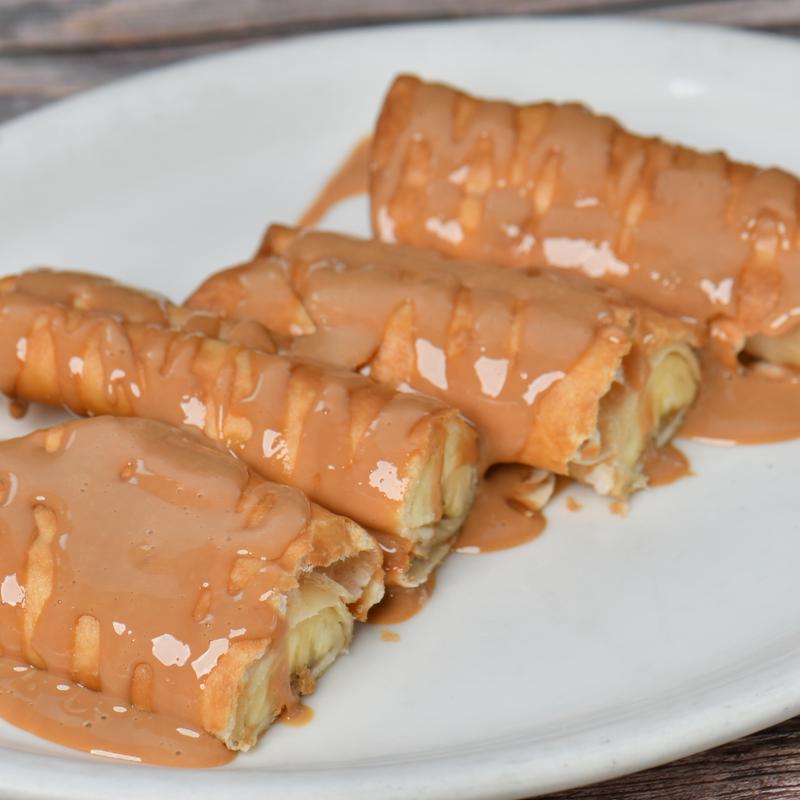 A banana wrapped in a tortilla then deep fried and covered with dulce de leche.
