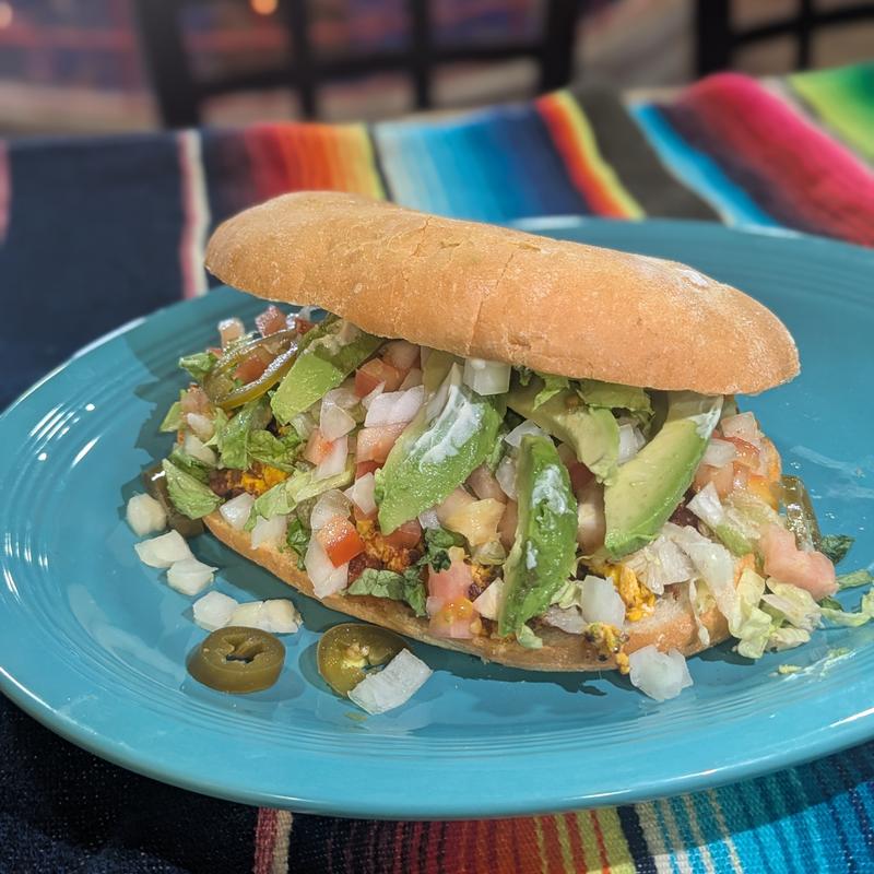 A sandwich stuffed with sour cream or mayo and your choice of meat layered with refried beans, lettuce, tomato, cheese, onion, jalapeño and avocado.