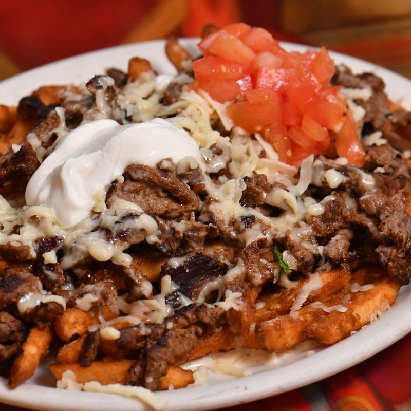 French fries topped with strips of steak, cheese sauce, sour cream, tomato and shredded cheese.