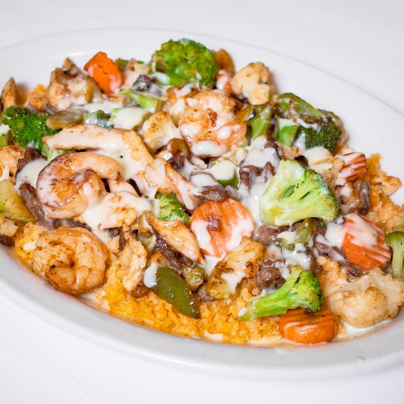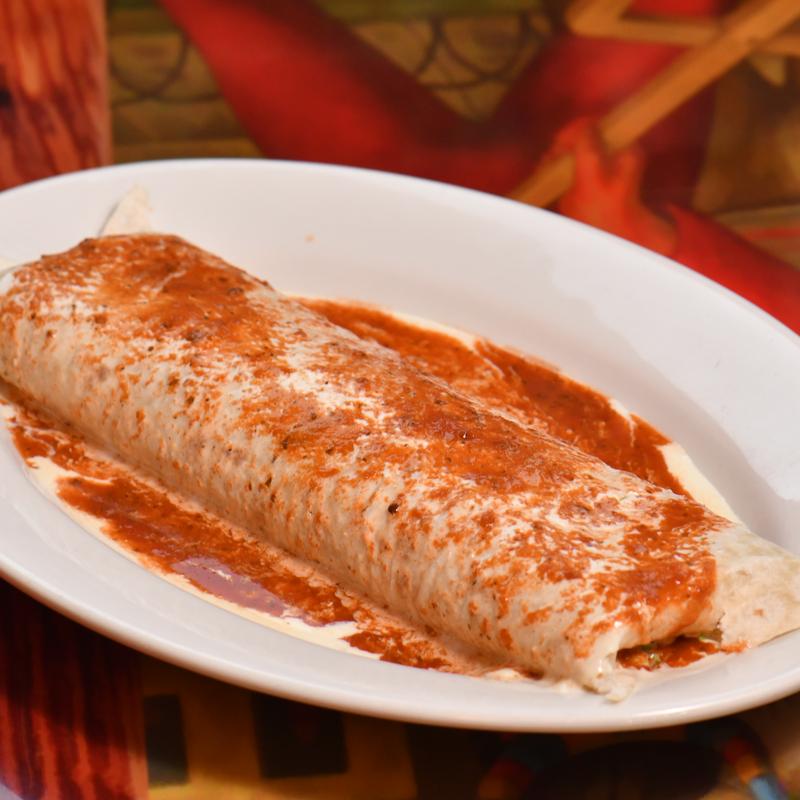 A monster burrito filled with steak, chicken, shrimp, onion, bell pepper, tomato and mushrooms. Topped with red sauce and cheese sauce.